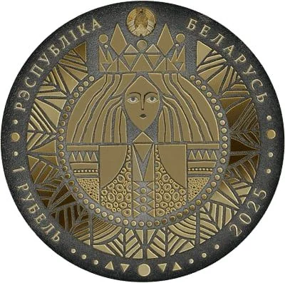 Description: Featuring the State Emblem of the Republic of Belarus at the top, this silver coin displays a stylized girl in the center. Below are the alloy standard, the minting year, and the 1 ROUBLE denomination.
