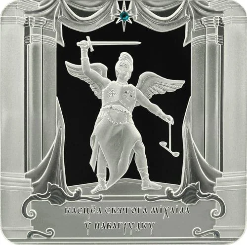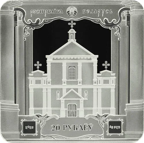 Description: Featuring the State Emblem of the Republic of Belarus and its name above, the coin's center depicts the façade of St. Michael's Church within a frame inspired by its interior. The denomination "20 ROUBLES" and the minting year are at the bottom.