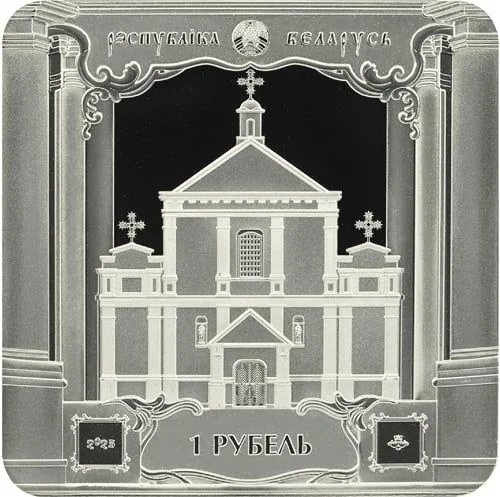 Description: State Emblem of Belarus at top, flanked by "REPUBLIC OF BELARUS." Central facade of St. Michael's Church, framed by motifs from its interior. Denomination "1 RUBLE" at bottom center, mint year at left.