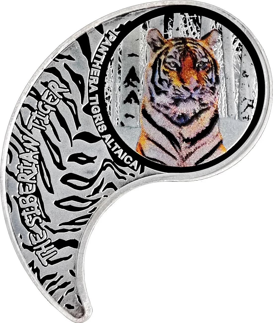 An Amur tiger in a birch grove, framed by a raised tiger-skin pattern with its name in Latin and English.