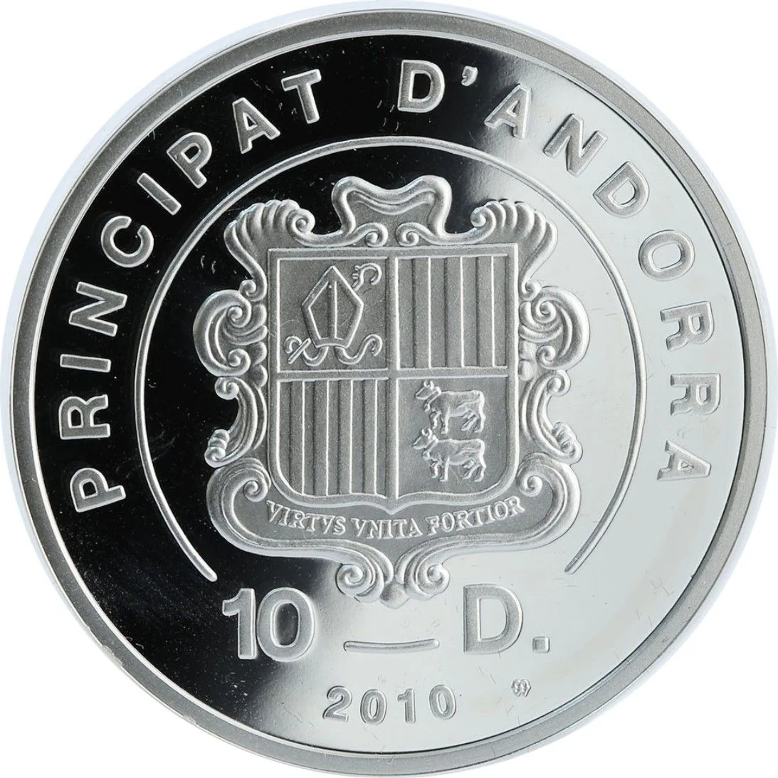 Andorran coat of arms featuring the motto "Virtus Unita Fortior" in a partial circle.