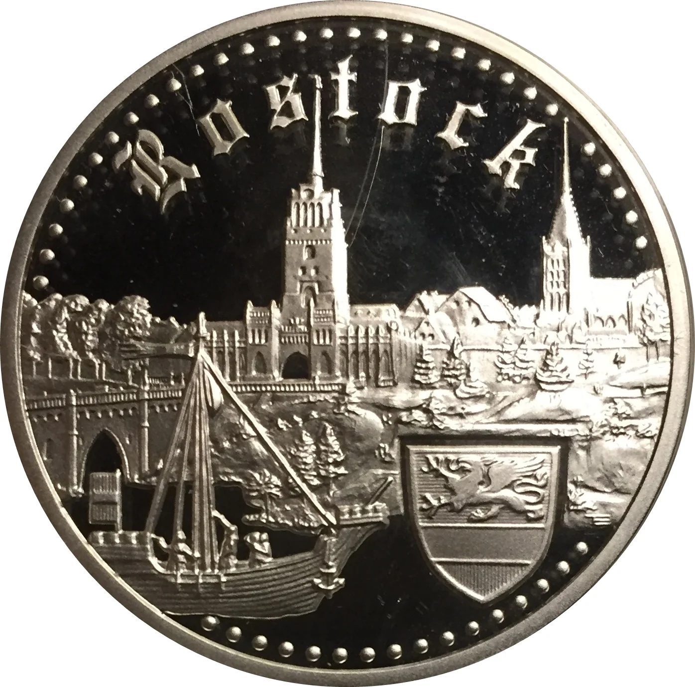 Kröpeliner Gate and St. James's Church in Rostock, with a Hanseatic cog and the city's coat of arms below.