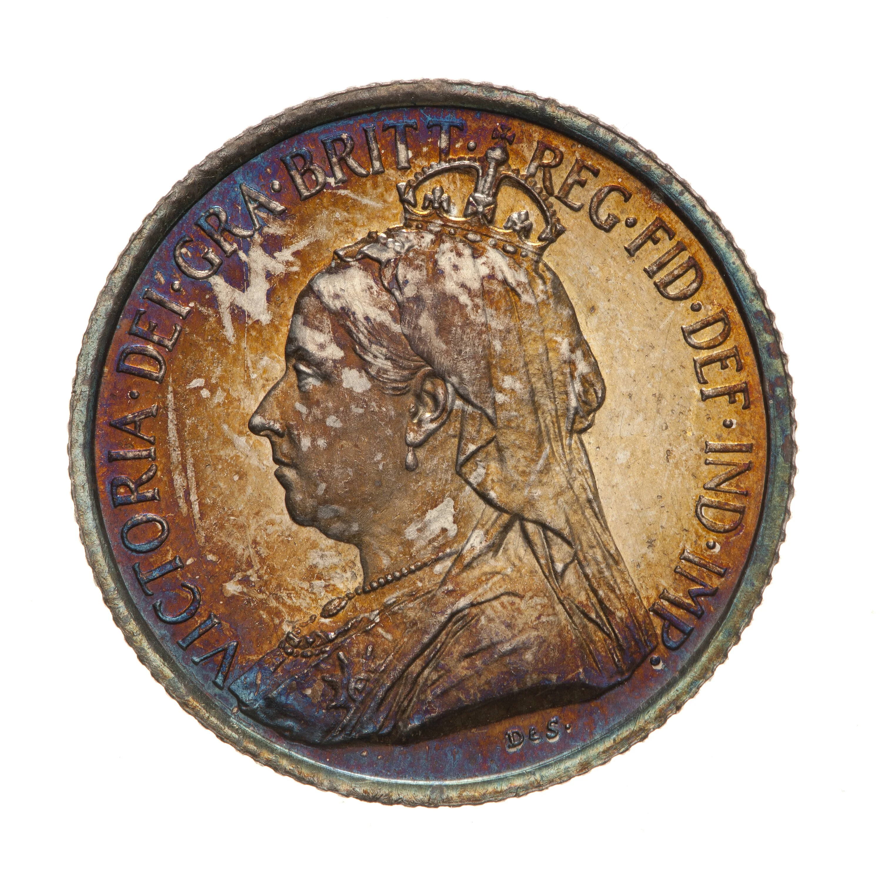 Veiled left-facing bust of Queen Victoria, crowned. "DeS" below, encircled by "VICTORIA.DEI.GRA.BRITT.REG.FID.DEF.IND.IMP."
