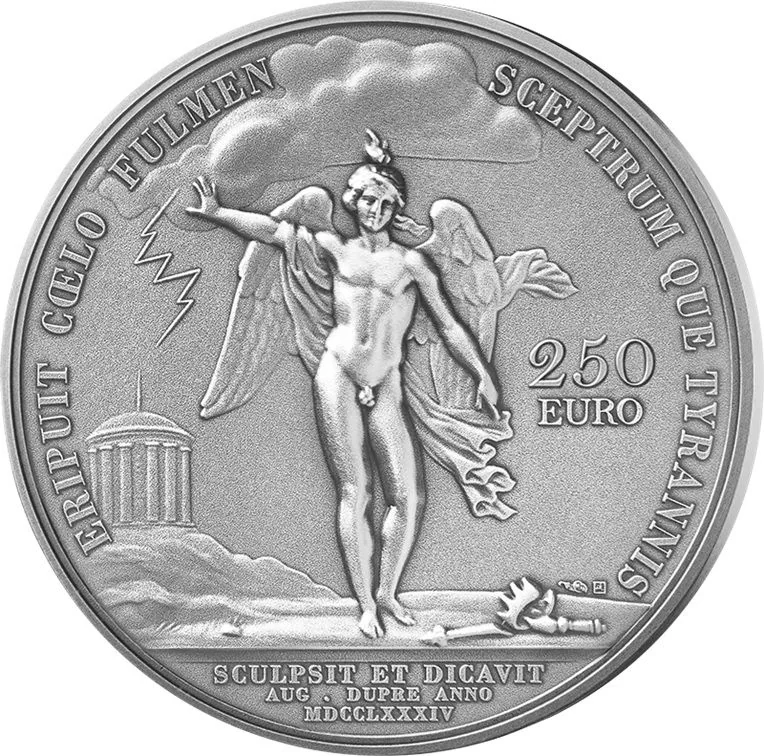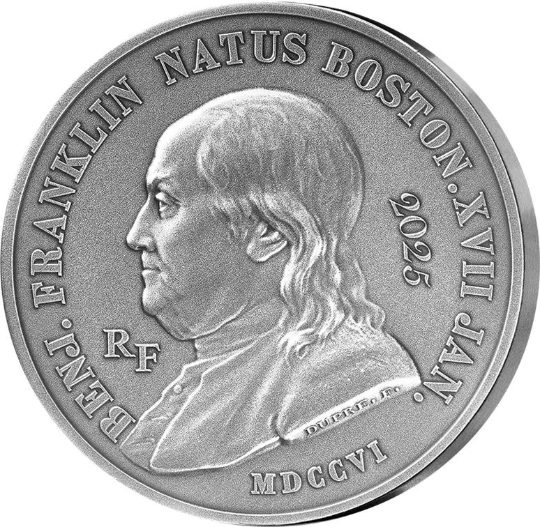 The reverse depicts a winged Genius with a lightning bolt before a temple, a broken crown and sceptre at his feet, symbolizing the triumph of science and freedom. The Latin legend "Eripuit coelo fulmen sceptrumque tyrannis" highlights Franklin's dual legacy.