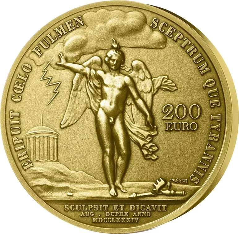 The reverse depicts a winged Genius with a lightning bolt before a temple, a broken crown and sceptre at his feet, symbolizing the triumph of science and freedom. The Latin legend "Eripuit coelo fulmen sceptrumque tyrannis" highlights Franklin's dual legacy.