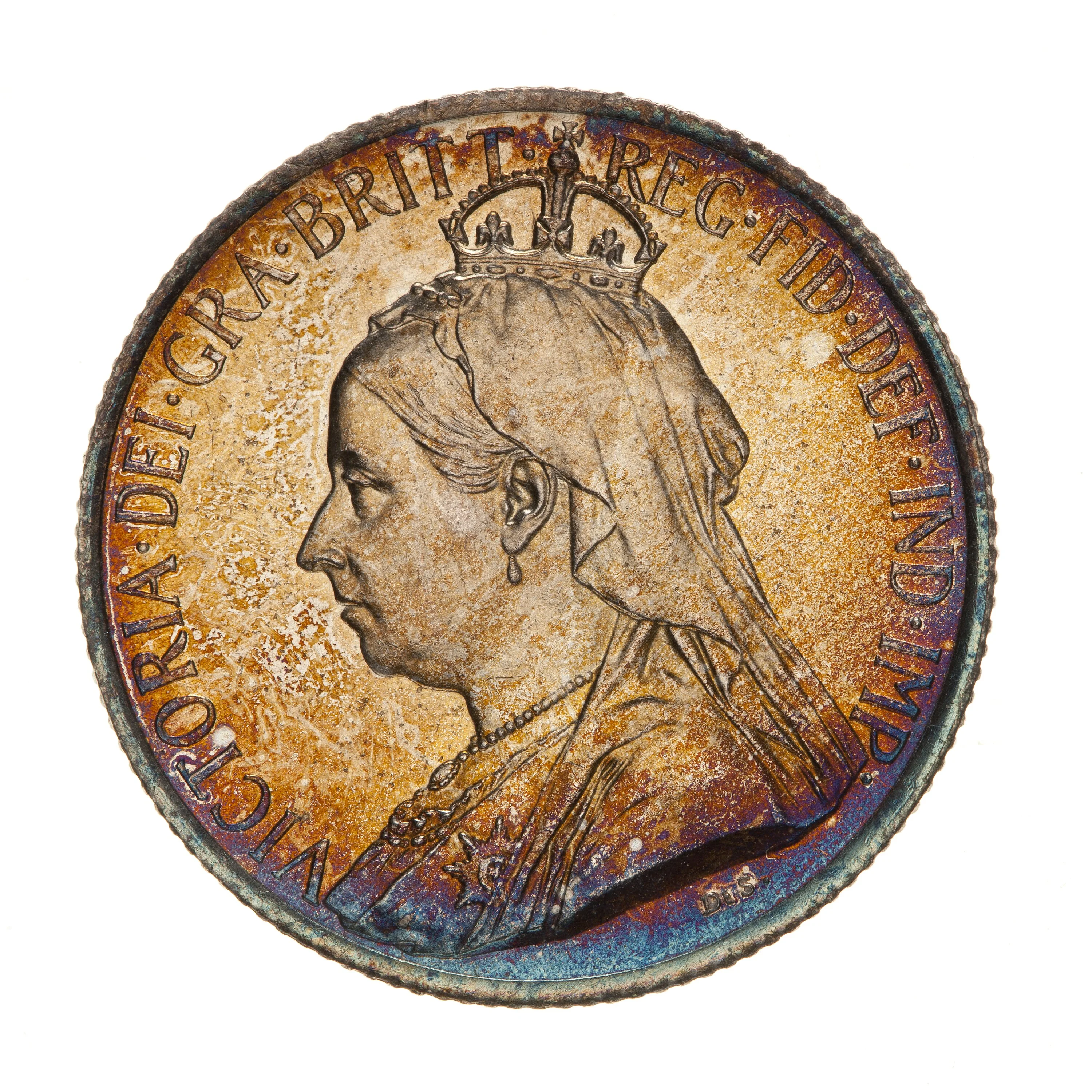 Veiled left-facing bust. "DeS" below, surrounded by VICTORIA•DEI•GRA•BRITT•REG•FID•DEF•IND•IMP•