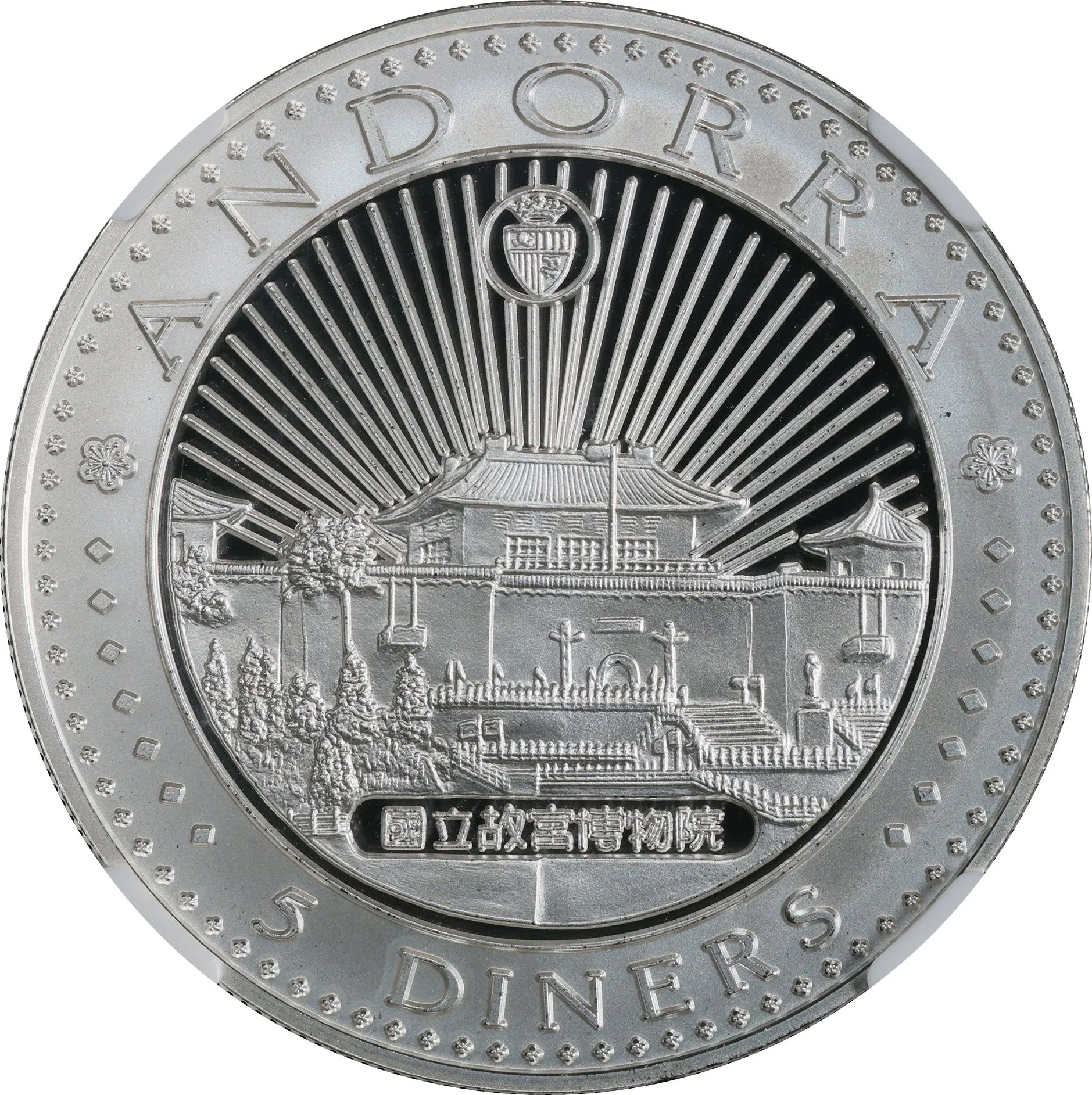 Traditional Chinese temple topped with lightning bolts and Andorra's coat of arms.