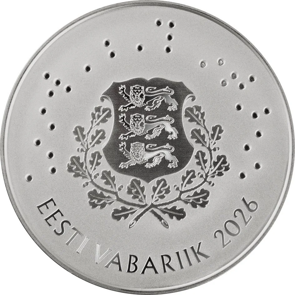 EESTI VABARIIK in Braille encircles the coat of arms, resembling falling snow.