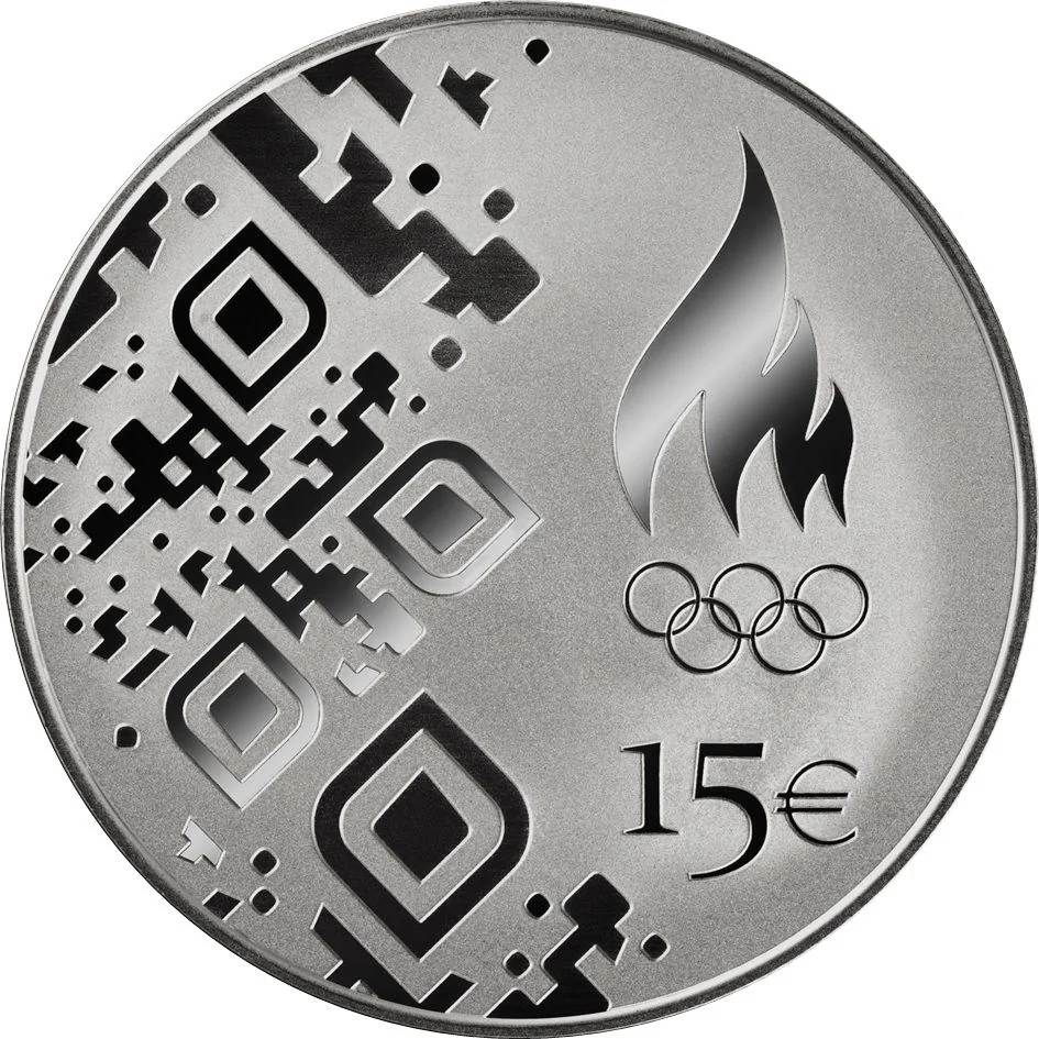A boot-print-shaped QR code links to the Estonian Olympic Committee, signifying openness. The Olympic logo and face value are to the right.