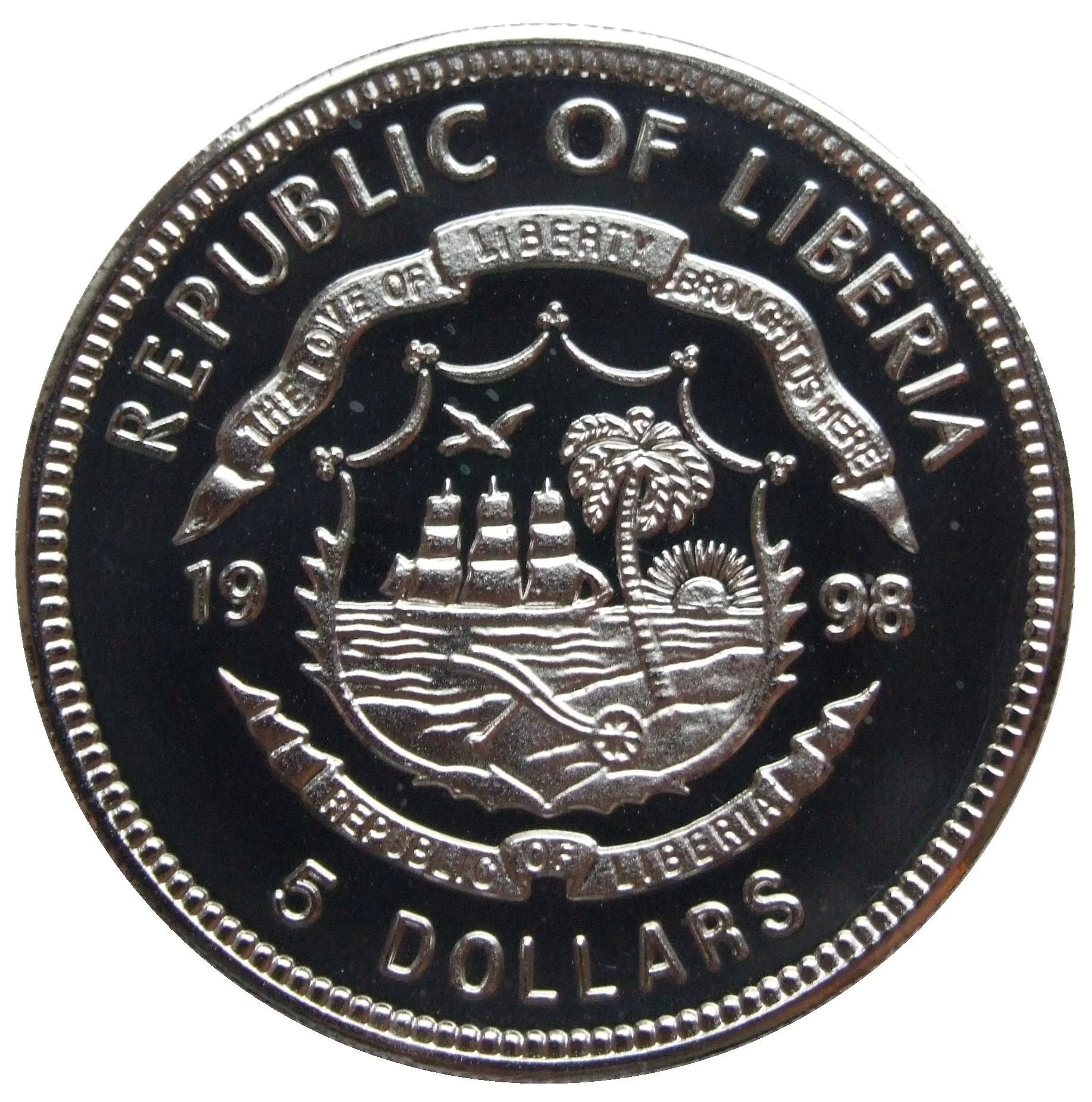 Liberian coat of arms divides date, denomination below.