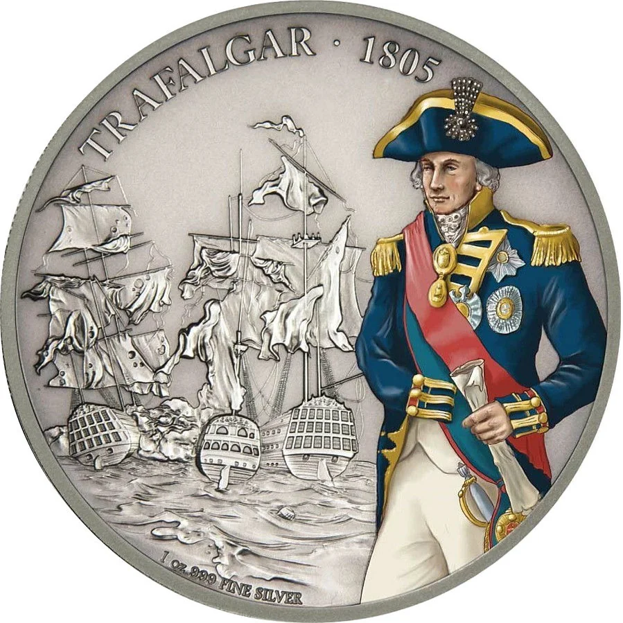 Colorized portrait of Lord Nelson alongside a naval battle.