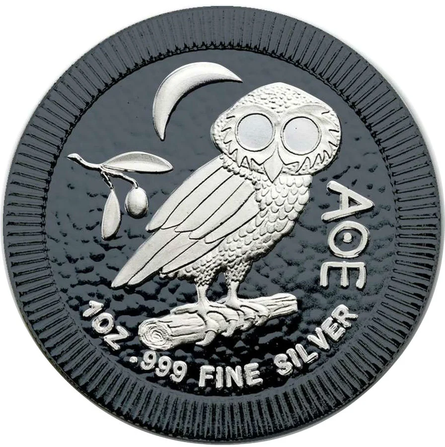 Owl on branch with crescent moon and olive branch. Metal and fineness below.