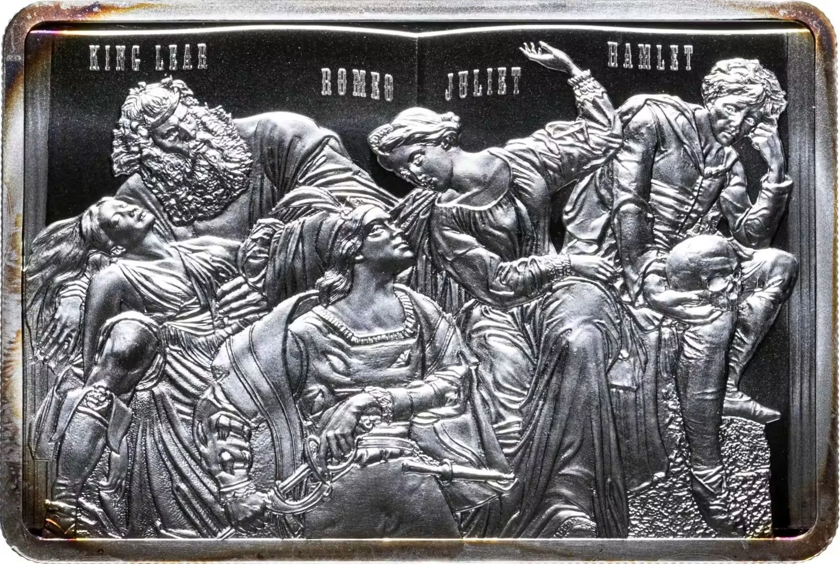 Elizabeth II bust left, colorized Shakespeare portrait right. Date, value, and metal details below.
