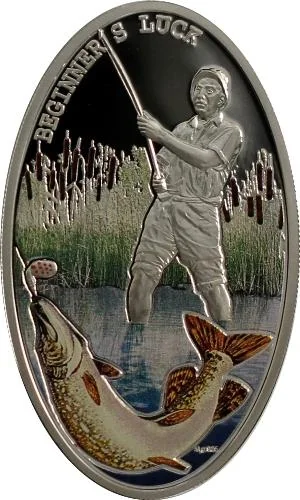 An angler knee-deep in water holds a caught pike. Lake plants are in the background.