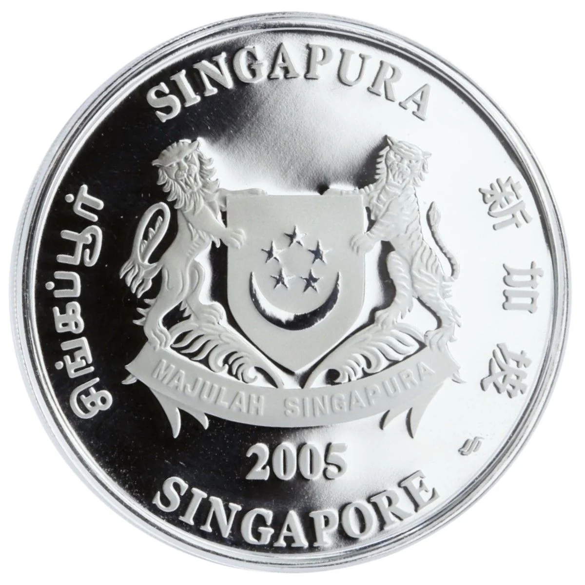 Emblem with date; 'Singapore' encircles it in English, Tamil, Chinese, and Malay.