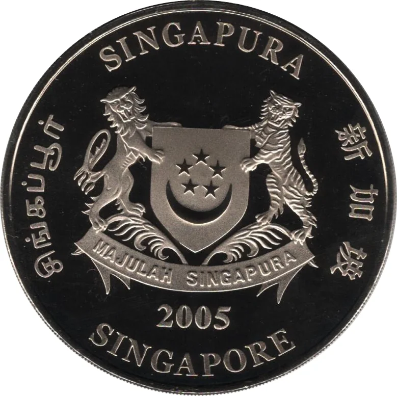 Emblem with date below and 'Singapore' in English, Tamil, Chinese, and Malay on four sides.