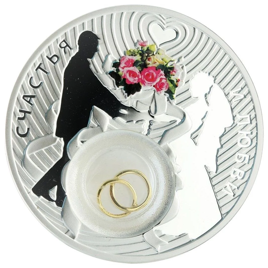 Outline of a couple with colorized flowers between them, and interlocked rings in a circle below.