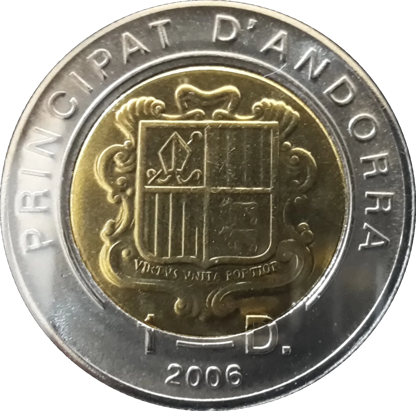 Andorran coat of arms featuring the motto "Virtus Unita Fortior" in a partial circle.