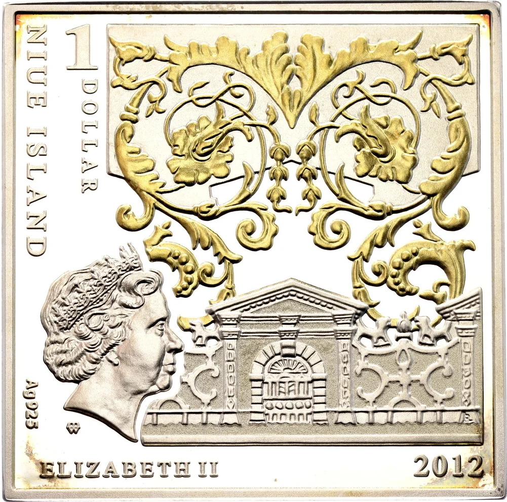 Portrait of Queen Elizabeth II in silver and gold ornamentation.