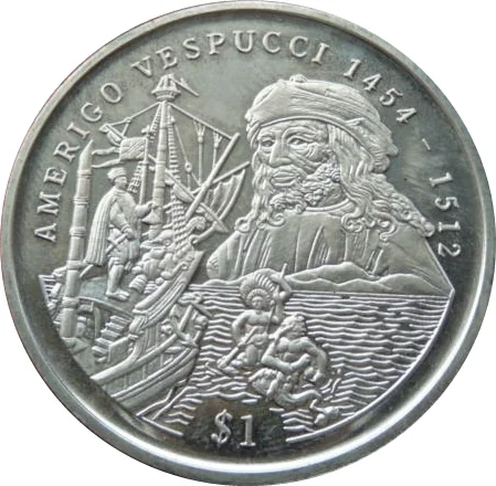 Amerigo Vespucci bust with a figure on a ship's bow.