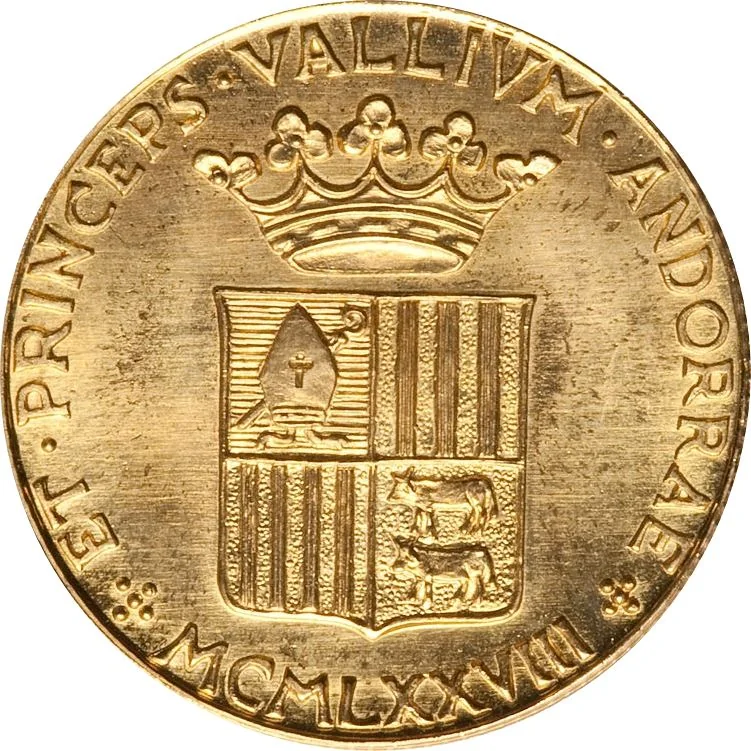 Crowned Andorran coat of arms above Roman numeral date.