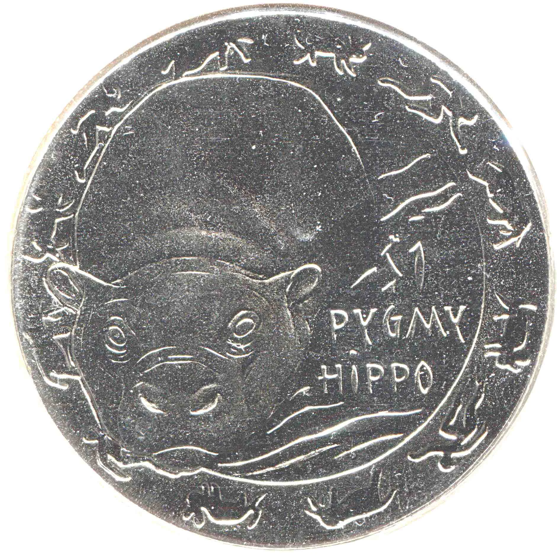 Dwarf hippo facing forward in water. Title on right.