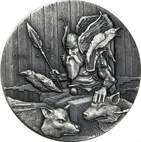 Odin on his throne with a crow and wolves.