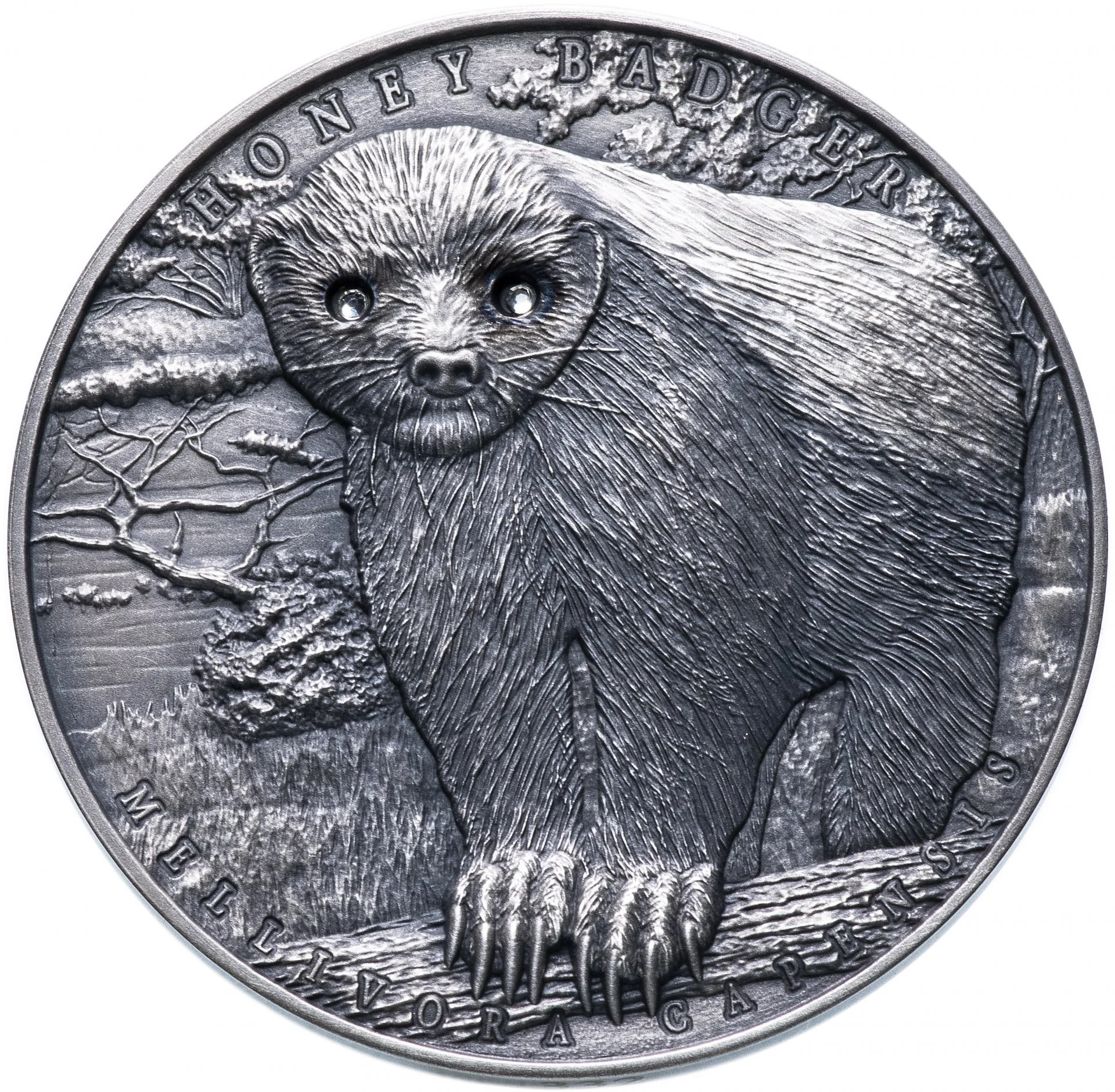 Queen Elizabeth II facing right, over an African map and honey badger outline.