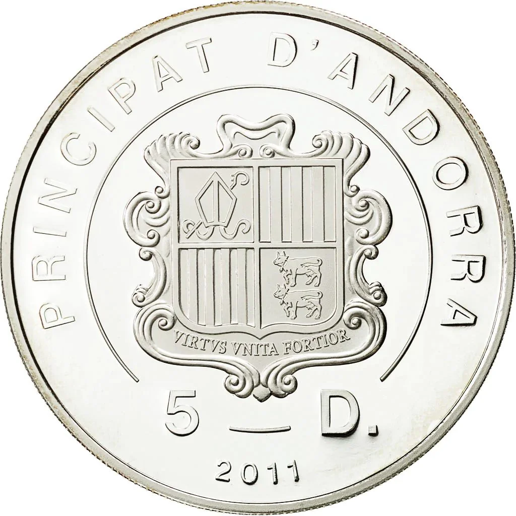 Andorran coat of arms featuring the motto "Virtus Unita Fortior" in a partial circle.