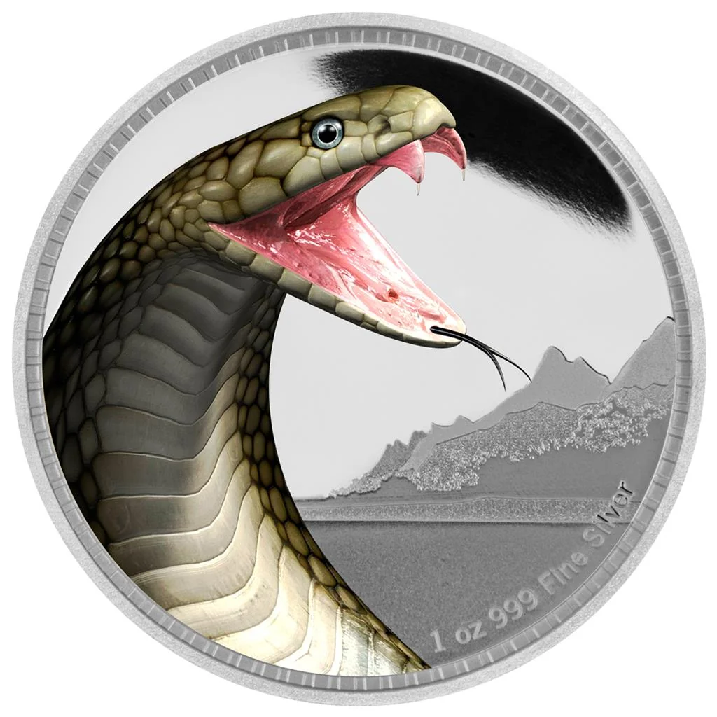 Colorized King Cobra with open mouth, mountains below.
