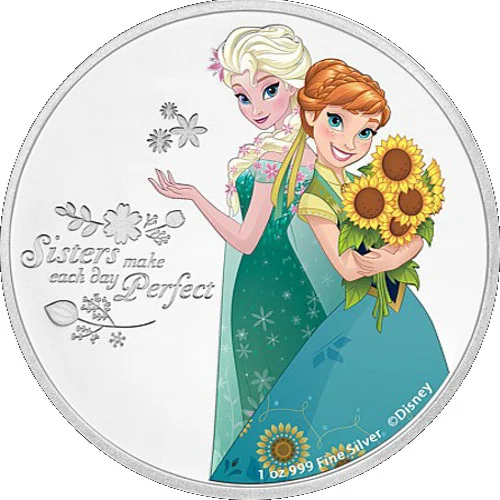 Colorized image of Anna and Elsa back-to-back, with lettering at left.