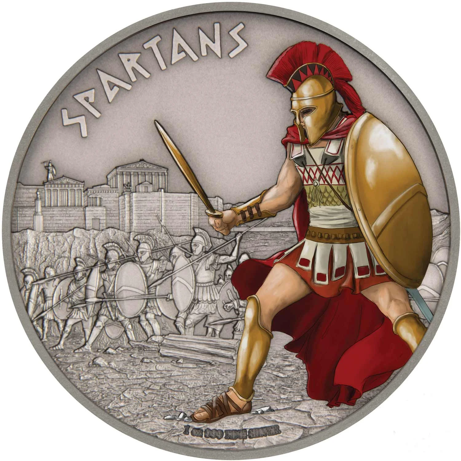 Colorized Spartan warrior in regalia, with city and fellow Spartans behind.