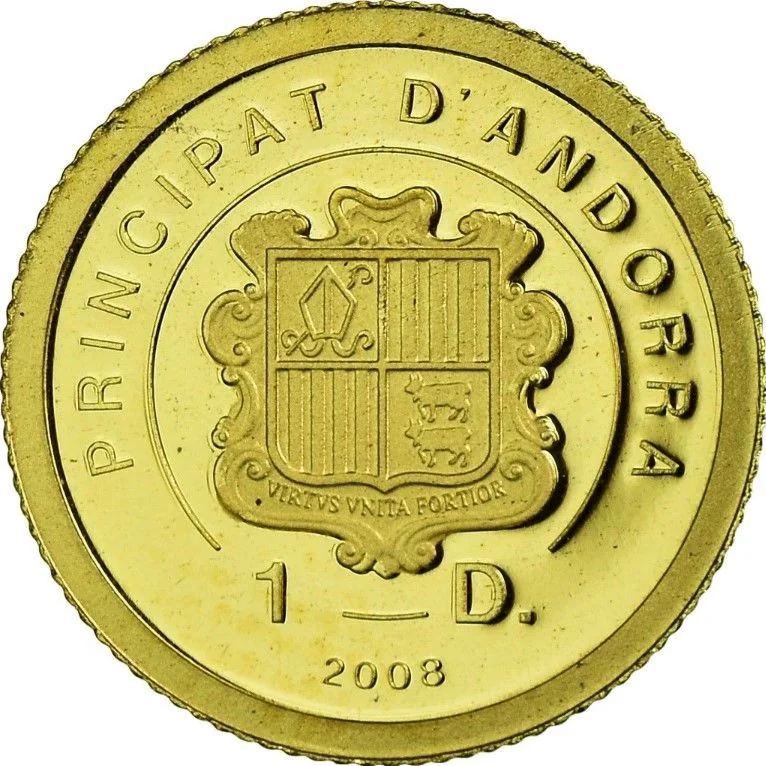 Andorran coat of arms featuring the motto "Virtus Unita Fortior" in a partial circle.