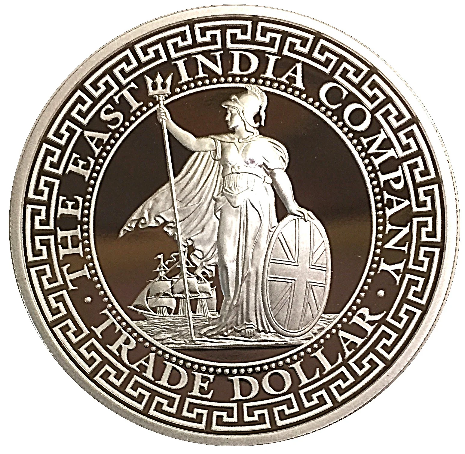 Description: Features an original British Trade Dollar design. The center depicts Britannia holding a trident and shield, with a sailing ship in the background. The perimeter has a traditional Chinese scroll pattern, echoing the 1895-1935 silver trade dollars.