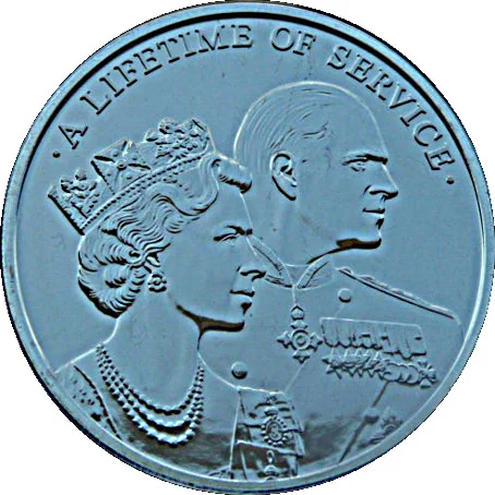 Queen Elizabeth II in crown and beaded necklace with Prince Philip in uniform and medals.