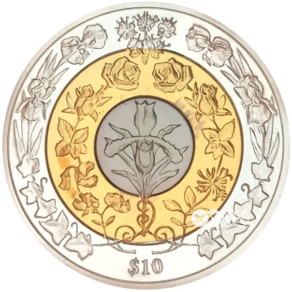 Royal couple center, flowers inner ring, country and year outer ring.