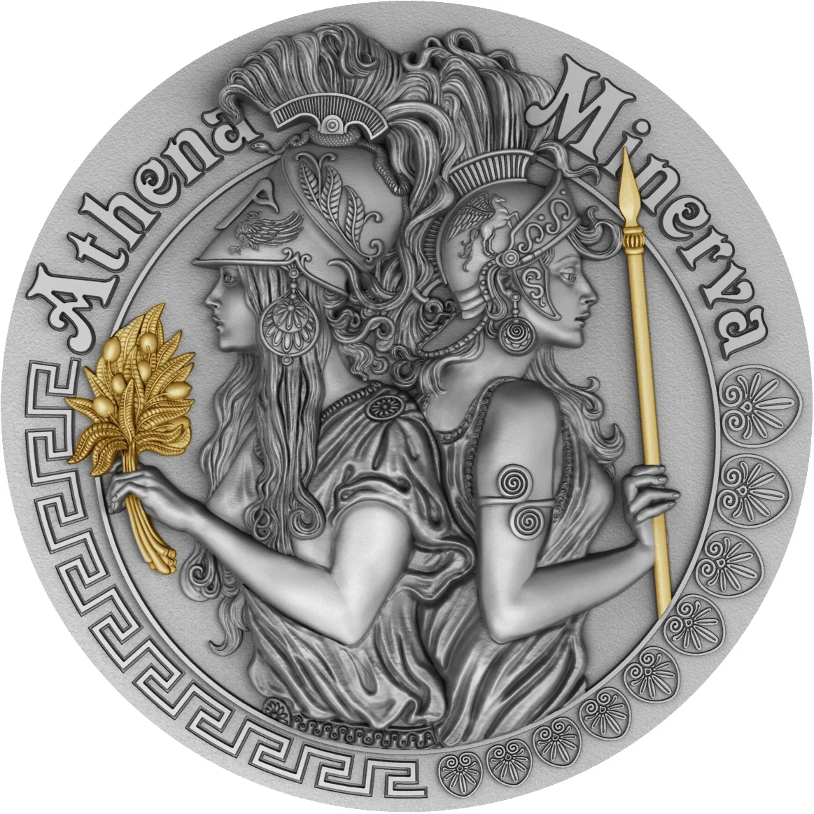 Athena, left, holds a gilded bouquet; Minerva, right, holds a gilded spear. Both are helmeted.
