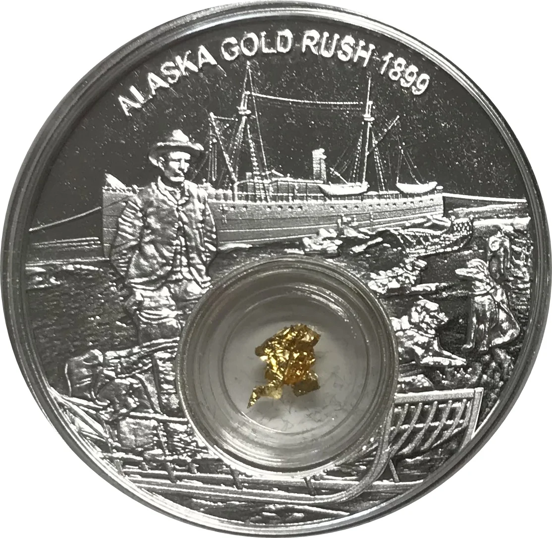 Clear plastic capsule, gold flake at top with radiant lines. Below: date, value, and bust of Elizabeth II to the right.