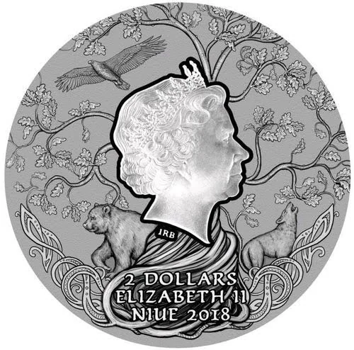 Portrait of Queen Elizabeth II with a bear, wolf, eagle, and foliage.