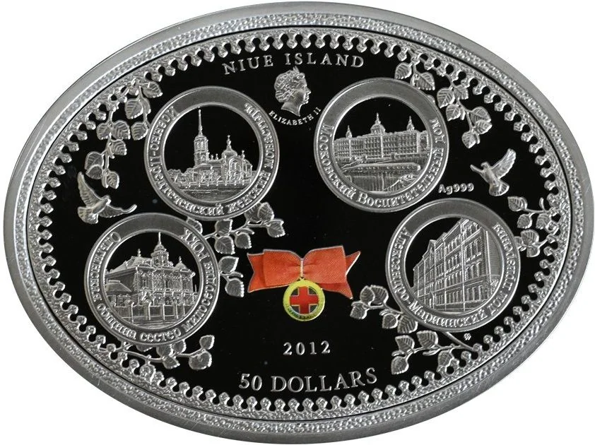 Queen Elizabeth II's effigy centered, surrounded by four building façades.