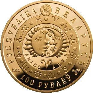 Description: The central image shows the Sun and Moon within a zodiac band, above the sign and inscriptions for Aries. The top features the State Coat of Arms of Belarus, while the bottom shows the year and mint marks. Circumferential inscriptions read "РЭСПУБЛIКА БЕЛАРУСЬ" above and "100 РУБЛЁЎ" below.