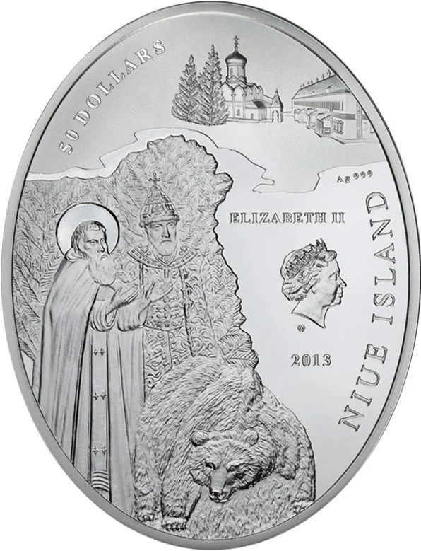 Alexis of Russia saved from a bear by Saint Sabbas of Storozhi and a likeness of Queen Elizabeth II.