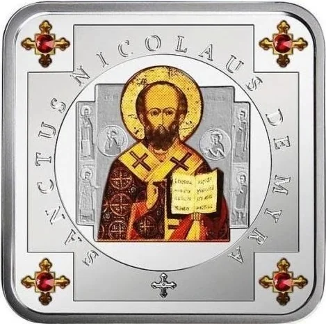Pad-printed Saint Nicholas with life scenes. Background: frosted Greek cross. Corners: gold classical crosses, each with a red Swarovski crystal.