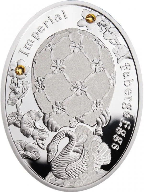 Description: The Swan Egg (1906), a gift from Tsar Nicholas II to his mother, is made of mauve enamel with a crystal trellis. Inside, a miniature gold and silver swan swims on an aquamarine lake. The reverse is adorned with two colored Swarovski crystals, reflecting the original's magnificence.