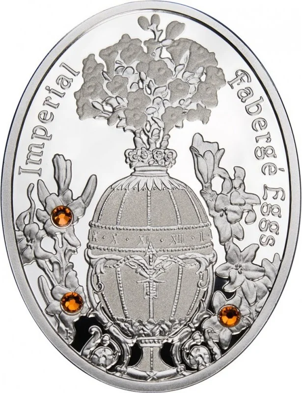 Description: The Bouquet of Lilies Clock Egg (1899) is crafted from varicolored gold, platinum, rose-cut diamonds, white onyx, and enamel. Like all Imperial Fabergé eggs, it was made for the Russian tsars. This reverse image is accented with Swarovski crystals to reflect the original's magnificence.
