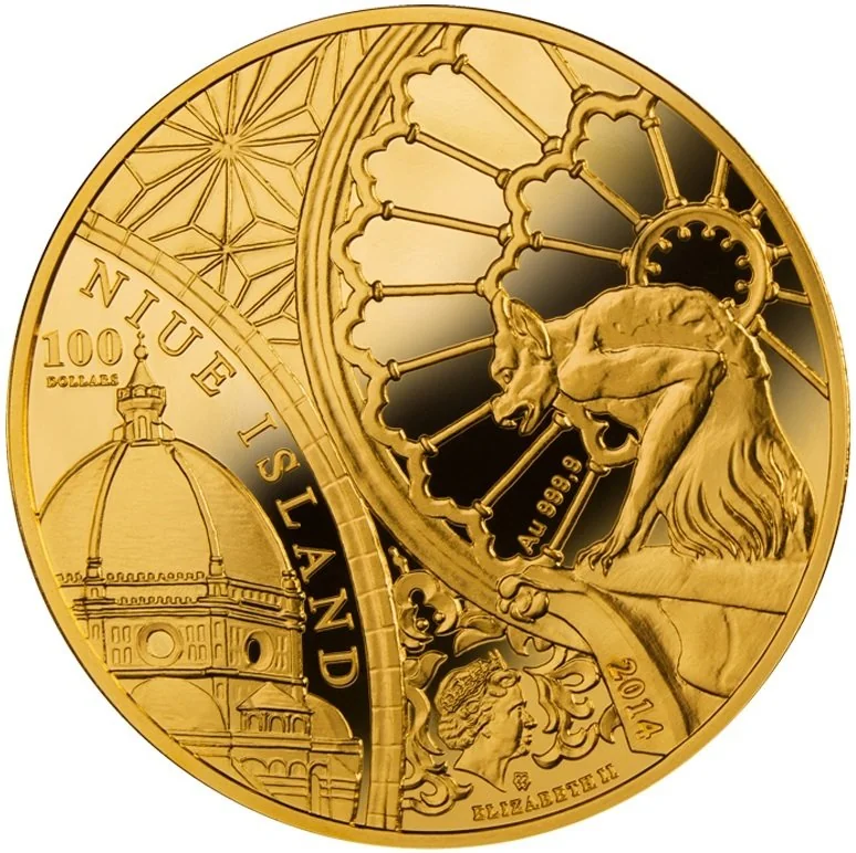 Left: Florence's Basilica of Saint Mary of the Flower dome. Right: Rosette and mascaron from Notre Dame Cathedral. Below: Profile of Queen Elizabeth II.