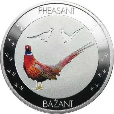 A pheasant in color, flanked by two silhouettes, encircled by stylized tracks.