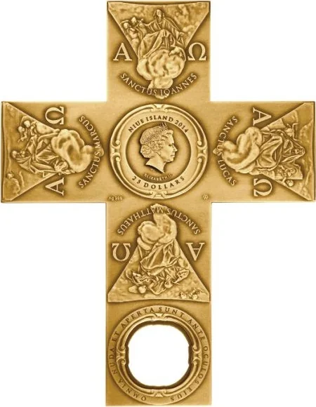 Description: The central effigy of Queen Elizabeth II is encircled by four bars depicting the Evangelists, extending into the cross's longer limb.