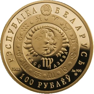 Bottom: Year of issue, alloy standard, and mint trademark, with circumferential inscription 100 РУБЛЁЎ.