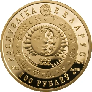 Description: Center: Sun and Moon within the zodiac band, with the sign of Aquarius and its name in Latin and Belarusian below. Top: Relief of the Belarusian coat of arms. Bottom: Year of issue and Mint of Poland mark. Circumference: "THE REPUBLIC OF BELARUS" above and "100 RUBLES" below.